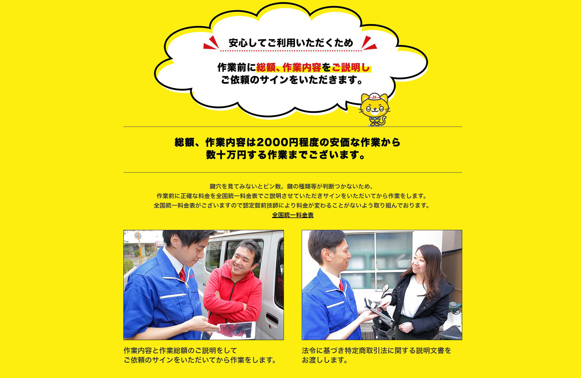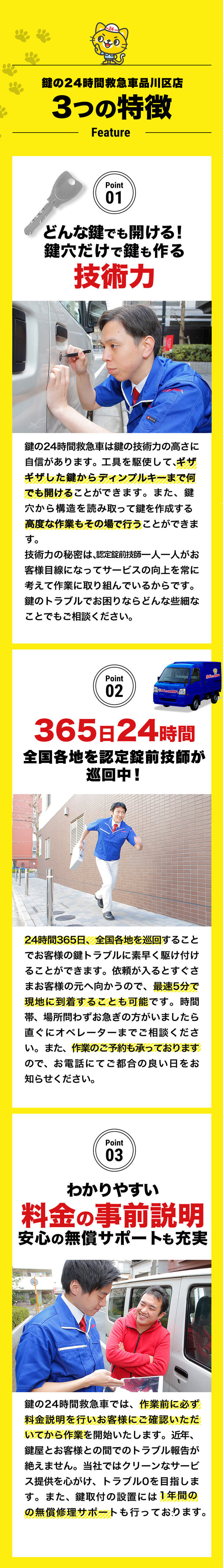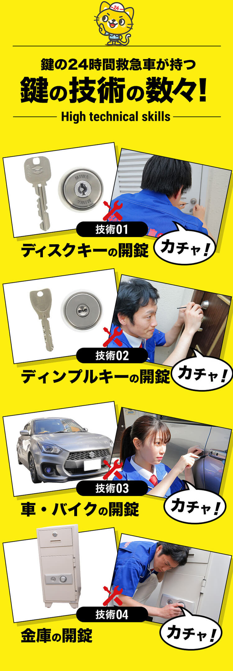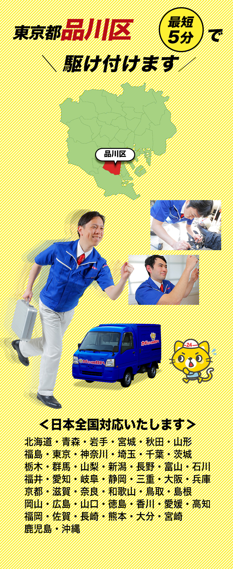 品川区で信頼されている「カギの出張24時間」は五反田、大井町エリアで迅速に対応いたします。明瞭な説明と正確な見積もりでお客様の信頼を得ることを最優先に考えています。地域に密着した親しみやすいサービスを提供し、作業後はお客様からの貴重なフィードバックをもとに、サービス品質を更に向上させています。